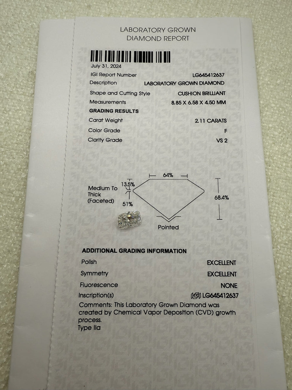 Discover the perfect centerpiece for your dream jewelry piece with this stunning 2.11 carat cushion brilliant lab grown diamond. A modern marvel of science and artistry, this diamond offers exceptional size, brilliance, and value without compromise. Its romantic, pillowy shape and dazzling fire make it an ideal choice for a show-stopping engagement ring or a bespoke heirloom.